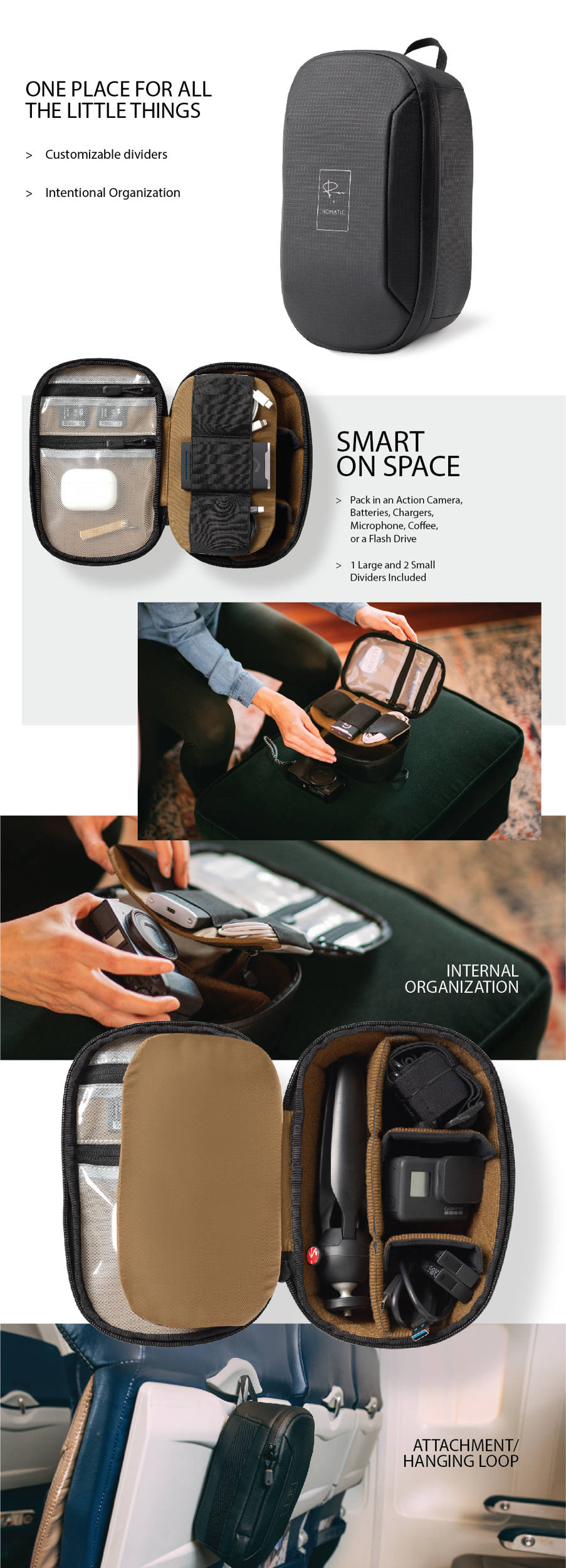 Tech Organizer je vyroben z odolných a voděodolných materiálů a zipů. Uvnitř tašky jsou 3 hlavní přihrádky. Na straně dveří jsou 2 průhledné kapsy. Uprostřed jsou 3 elastické smyčky pro organizaci kabelů a drobností. Hlouběji je část pouzdra s nastavitelnými přepážkami, které umožňují uspořádat věci podle potřeby. Na vnější straně organizéru je zavěšovací poutko a zadní popruh pro snadné uchopení a přenášení.
